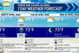 SEAS: Caicos Bank & Atlantic Nearshore – 2 to 4 feet; Atlantic Offshore – 4 to 6 feet, increasing up to 7 feet by the evening